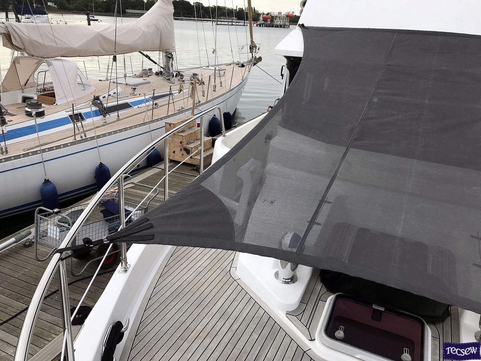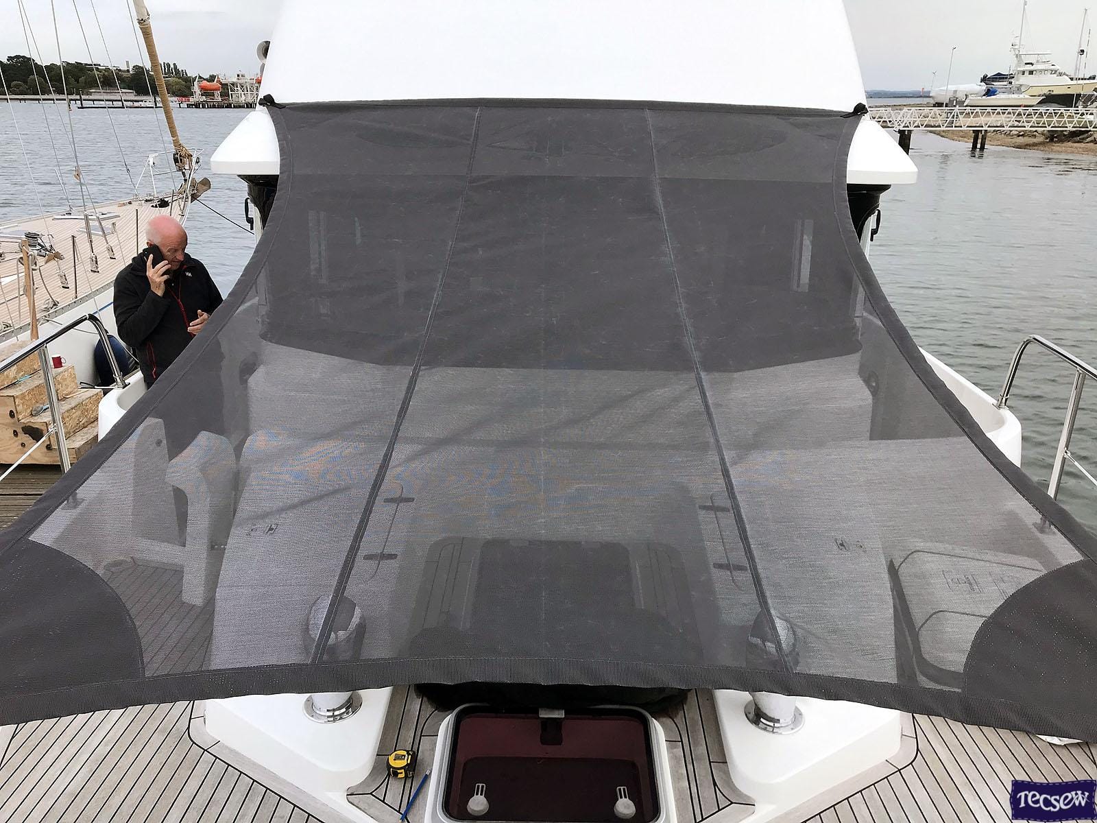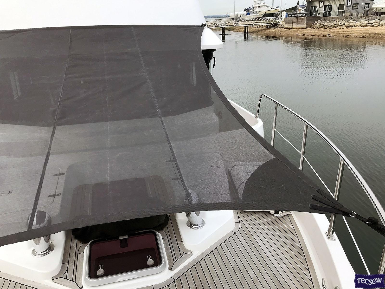 Fore Deck Sun Awning in Soltis 86 Shade Mesh Fabric to complement the Biminis we designed and installed on this boat.